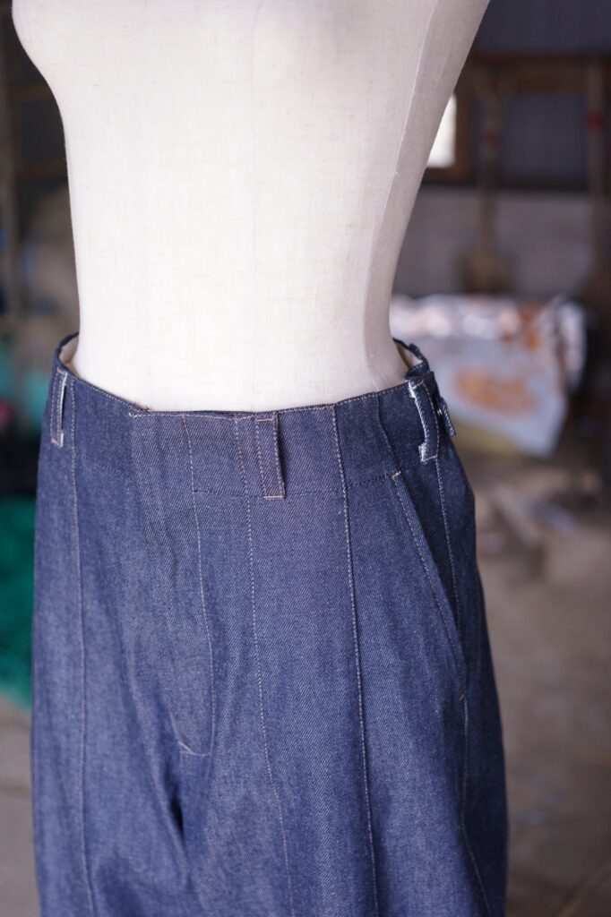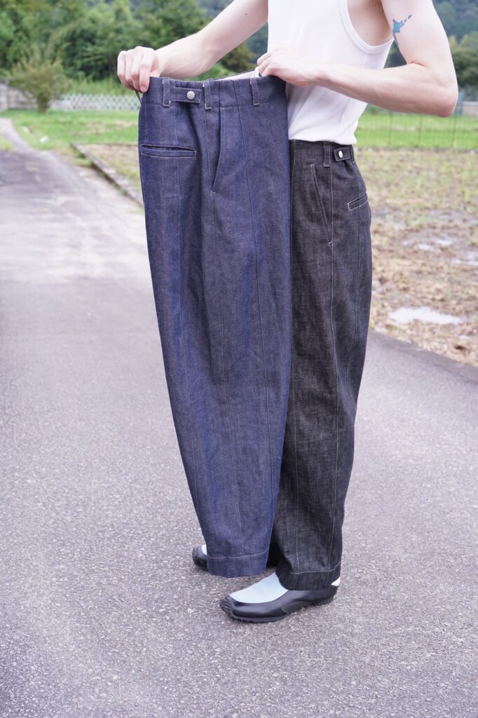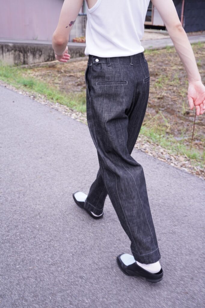 デニムのパターンを縦割りにし、片足を縦8パーツを使って作り上げるデニム。
