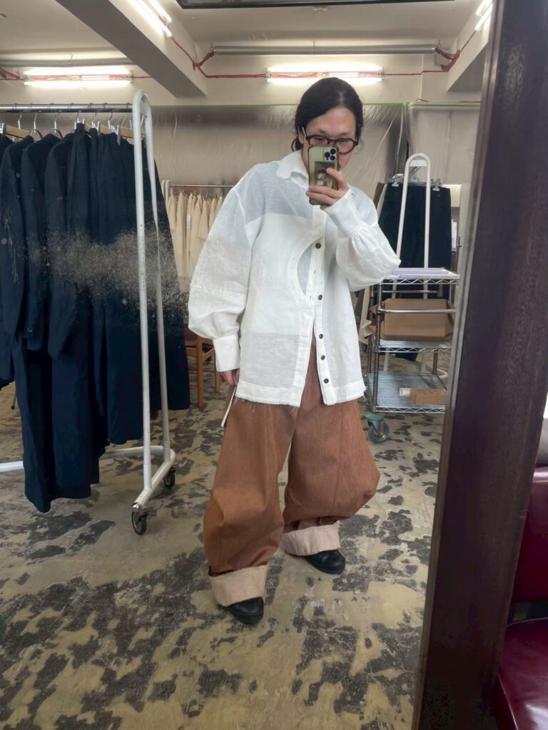 TISCARの服(特にパンツ)は立体的なつくりになっており「織りネームを取っても彼女の服だとわかる」そんな唯一無二性を探求し自分だけのどこにもない服を目指しています